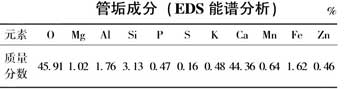 3)刮取管內垢樣進行成分分析見圖,從分析結果看,主要成分包括鈣44.36%,鎂1.02%,硅3.13%等易形成硬垢的成分,此外還有磷、鋅、鐵等成分應是阻垢劑成分和腐蝕產物在管壁內沉積的產物;
