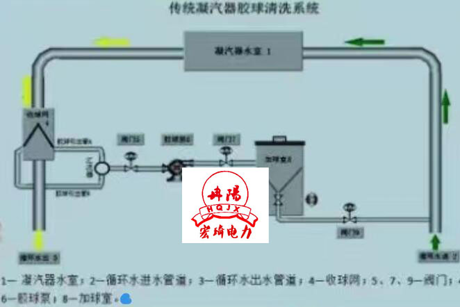3、海綿剝皮膠球在系統中運行方式:膠球在系統中排隊方式流動,從收球網膠球泵 →加球室→循環水進水管道→凝汽器水室入口→凝汽器水室出口→收球網循環。