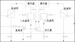 膠球清洗裝置由膠球、二次濾網(wǎng)、收球裝置、裝球室、分匯器、管道、閥門、膠球泵及膠球清洗程控裝置等設(shè)備組成。
